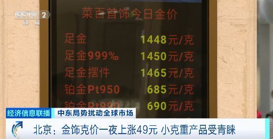 (央视财经《经济信息联播》)随着黄金价格震荡走高,今天下午,记者在北京多家黄金销售门店走访发现,有门店金饰价格一夜上调49元。不少计划购买金饰的消费者转向小克重产品,而黄金投资者则整体趋于理性,观望情绪浓烈。